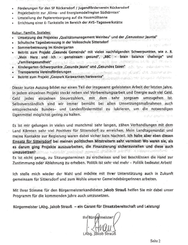 an jeden Gemeindehaushalt ergangene Schreiben[…] enthält im Wesentlichen einen direkt an die Wahlberechtigten der Gemeinde gerichteten Aufruf, den Amtsinhaber und Aussender des Schreibens, Jakob Strauß, anlässlich der bevorstehenden Bürgermeisterwahl wieder zu wählen.