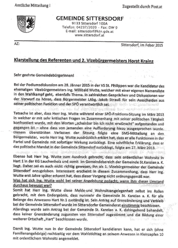 'Bei der Podiumsdiskussion am 28. Jänner 2015 in der VS St. Philippen war die Kandidatur des ehemaligen Vizebürgermeisters Ing. Willibald Wutte, welcher mit einer eigenen Namensliste in den Wahlkampf geht, ebenfalls Thema. In zahlreichen Gesprächen und Diskussionen war der Vorwurf zu hören, dass Bürgermeister LAbg. Jakob Strauß für sein Ausscheiden aus seiner politischen Funktion und der SPÖ verantwortlich sei.