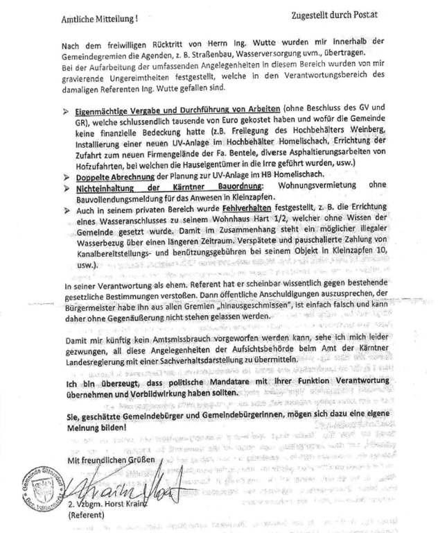 Die gleichermaßen amtliche Aussendung des damaligen 2. Vizebürgermeisters Horst Krainz erging ebenso an jeden Gemeindehaushalt und war an die bei den bevorstehenden Gemeinderats- und Bürgermeisterwahlen Wahlberechtigten der Gemeinde gerichtet. Sie ist mit 'Klarstellung des Referenten und 2. Vizebürgermeister[s] Horst Krainz' tituliert und greift den Erstanfechtungswerber bzw. den von der Zweitanfechtungswerberin namhaft gemachten Kandidaten Ing. Willibald Wutte bereits in den ersten beiden Absätzen verbal an: