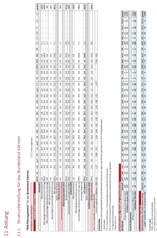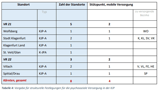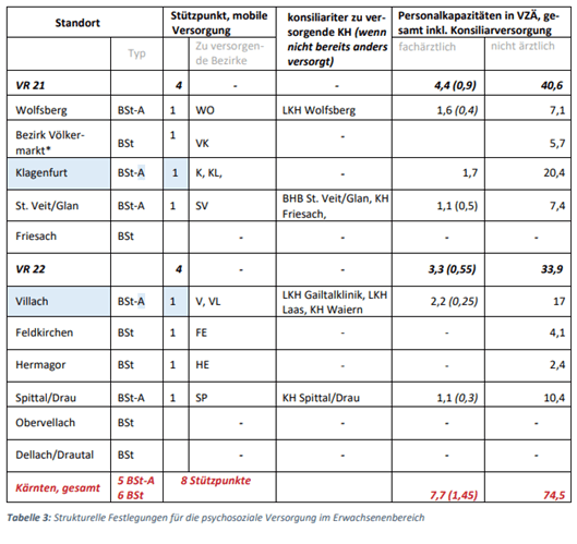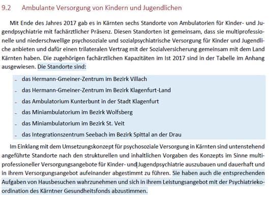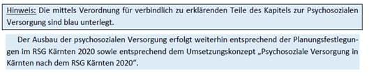 Soweit die Planung der psychosozialen Versorgung nach §1 Abs1 Z3 iVm Anlage 1 Punkt 9 der Verordnung betroffen ist, ist im Hinblick auf die verbindlichen (jeweils blau hinterlegten) Teile aus dem Regionalen Strukturplan Gesundheit – Kärnten 2025 nicht ersichtlich, dass darin bundesgesetzliche Vorschriften durchgeführt werden, die ihre Grundlage in Art10 B VG hätten (siehe bereits oben in Abschnitt II.2.). Vielmehr haben die strukturellen Vorgaben unter den Punkten 9.1 und 9.2 der Anlage 1 jeweils die Standorte und die Zahl der Ambulatorien iSv §2 Z5 und §13 K-KAO zur Versorgung von Erwachsenen bzw von Kindern und Jugendlichen zum Gegenstand, während sich die Regelung zur Durchführung von Hausbesuchen durch die Ambulatorien auf §2 Z5 letzter Satz und §13 Abs7 K-KAO stützt (vgl auch die Grundsatzbestimmungen des §2 Abs1 Z5 letzter Satz und §3a Abs7 KAKuG).