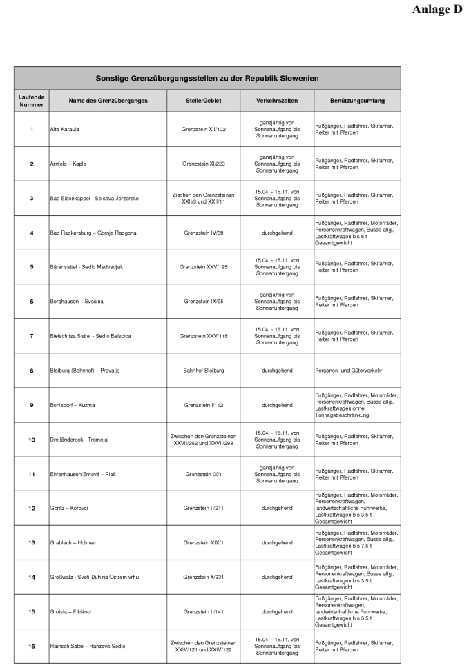 4. Anlage D: alle sonstigen Grenzübergangsstellen zu der Republik Slowenien;