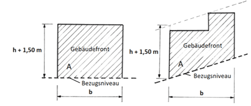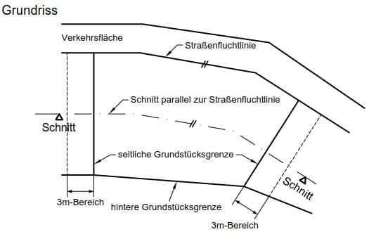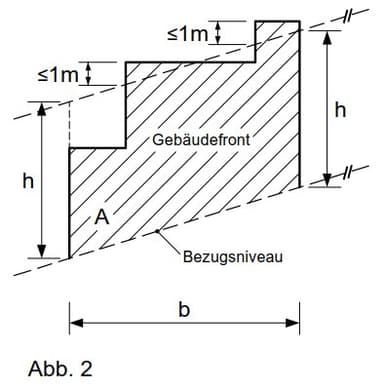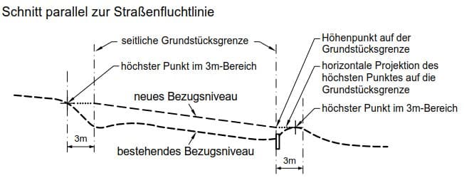 Das neue Bezugsniveau am Grundstück darf durch zur Straßenfluchtlinie parallele und konstant steigende oder fallende Verbindungslinien zwischen den Höhenpunkten der gegenüberliegenden Grundstücksgrenzen festgelegt werden (Abb. 2).