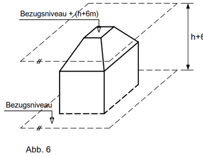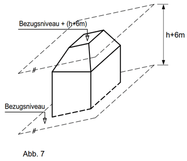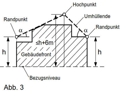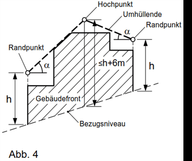 Das erhöhte Bezugsniveau darf in keinem Punkt höher liegen als die geradlinige Verbindung des höchsten Punktes des Bezugsniveaus am Grundstück mit dem ursprünglichen Bezugsniveau entlang der Grundstücksgrenzen.